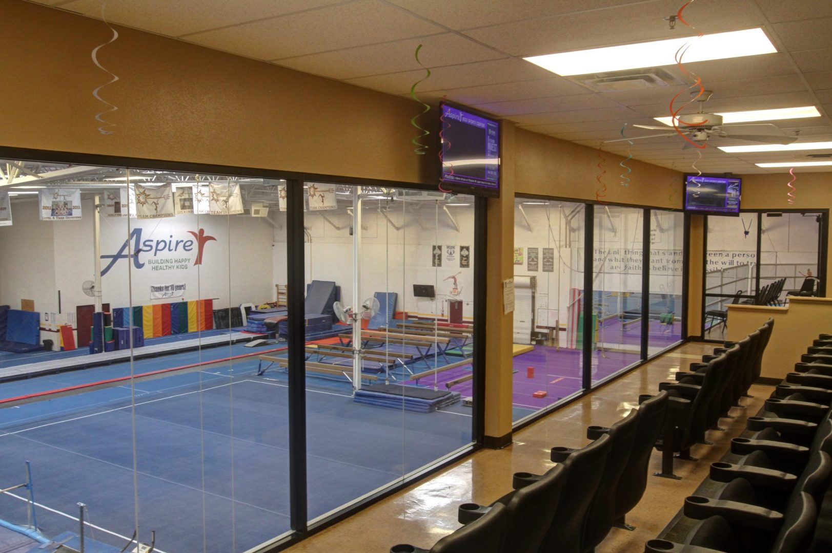 Camp, Open Gym, Tumbling Clinic, and Parents Night Out: Once your child is checked in, please stay with them until they’ve joined their group. After that, you may leave and return before the class ends, or you’re welcome to stay and watch from one of our viewing areas.
